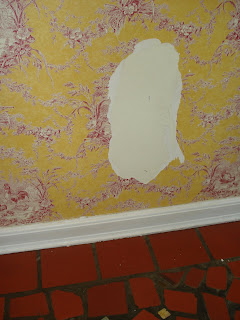 Beasley (aka Devil Dog) started this project for us. Don’t ask me how in the world he managed to get the wallpaper off the wall with his claws. But he did. My husband about came unglued. I looked at it as an opportunity to get a project going that was long overdue. I had a love/hate relationship with the toille anyway.