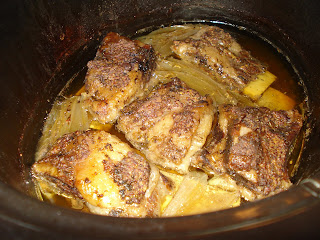 Put the short ribs in the slow cooker with the bone side down, add 1 inch of water in the crock. Sprinkle garlic powder, Cavenders, salt and pepper over the top, then spread some grainy mustard on top. Cook on low all day, or high for half a day.