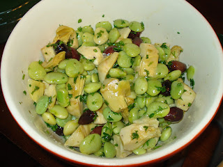 Cook lima beans for 4 minutes in boiling H20. Rinse under cold water. Mix beans, olives, artichoke hearts with olive oil, lemon juice, garlic, salt and pepper. Chill and enjoy!